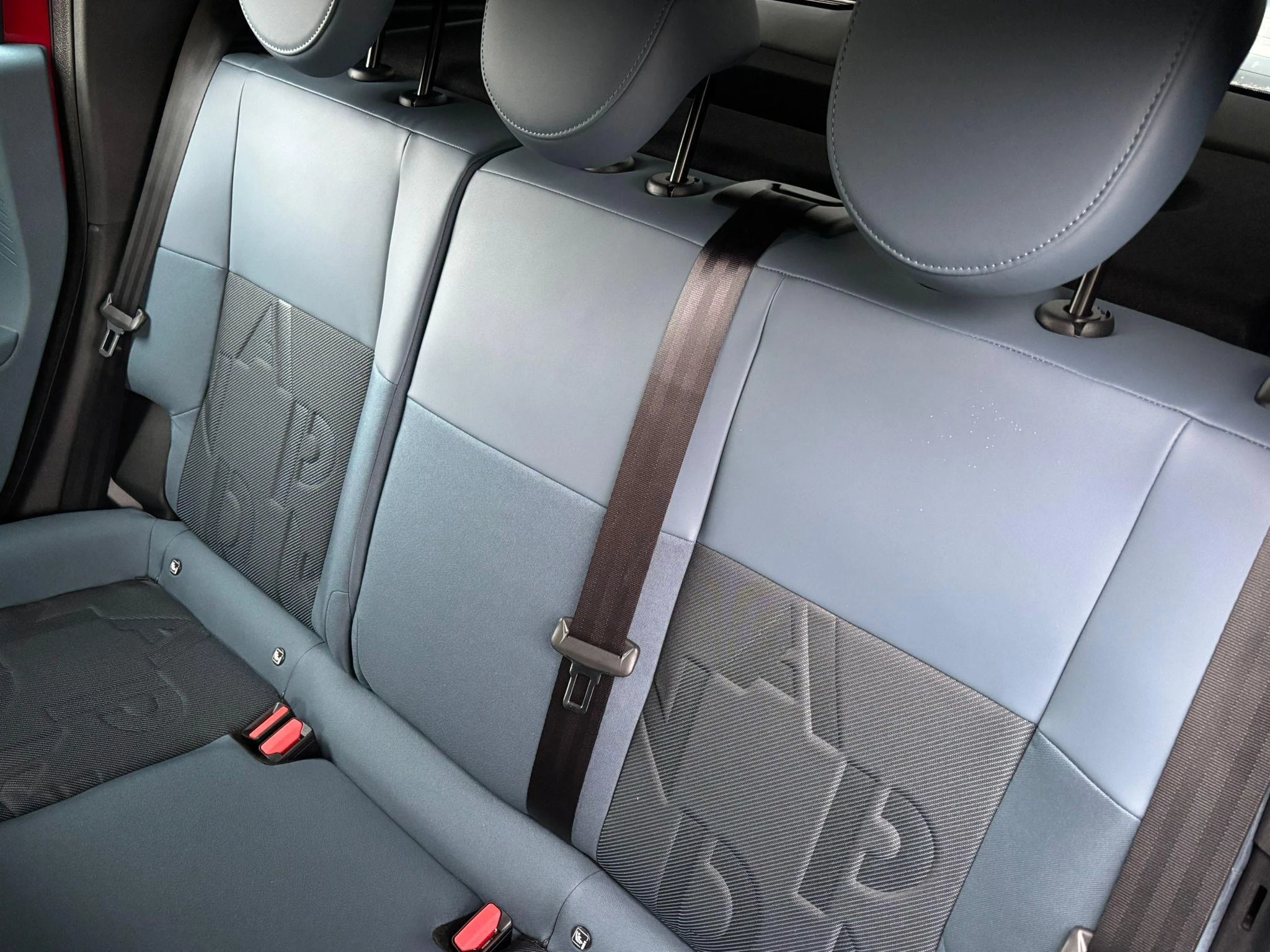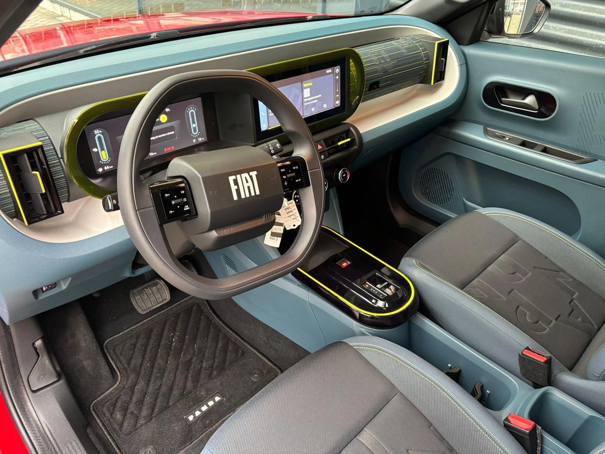Blauwe stoffen stoelbekleding “Style” met gele stiksels én Panda-logo